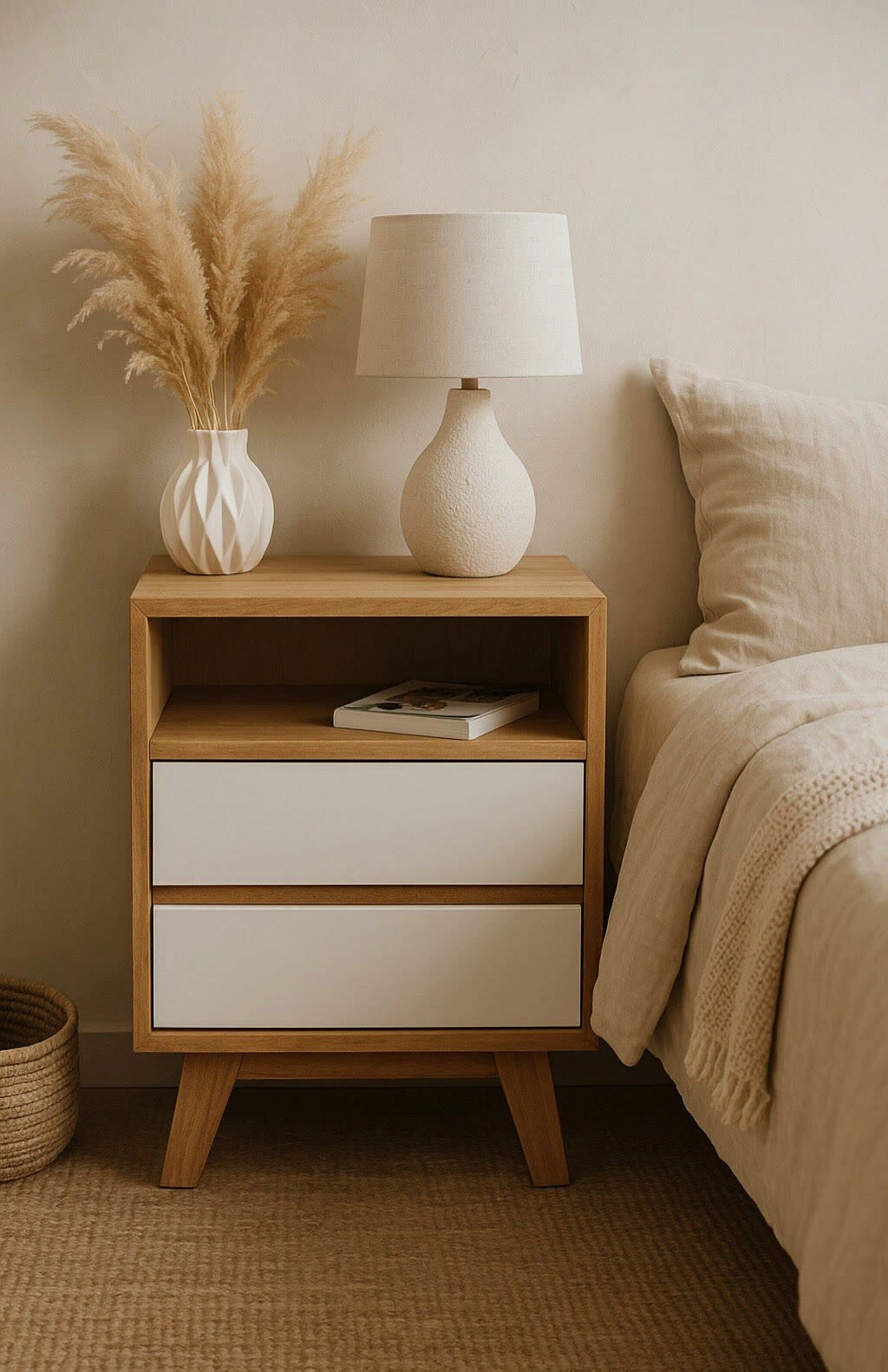 Detalle: 1 espacio abierto, 2 cajones con correderas metalicas, los interiores de los cajones son de melamina blanca. Patas de madera maciza.